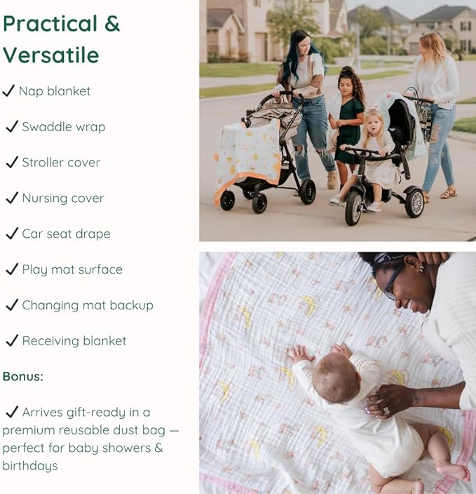 - PERFECT FOR TRAVEL AND OUTDOOR USE: Lightweight yet cozy, this muslin baby blanket is ideal for on-the-go families. Whether you're taking a stroll, heading to the park, or traveling, its versatile size and breathable design ensure your baby stays comfortable. Use it as a stroller cover, car seat blanket, or picnic mat, making it an essential accessory for adventures big and small.