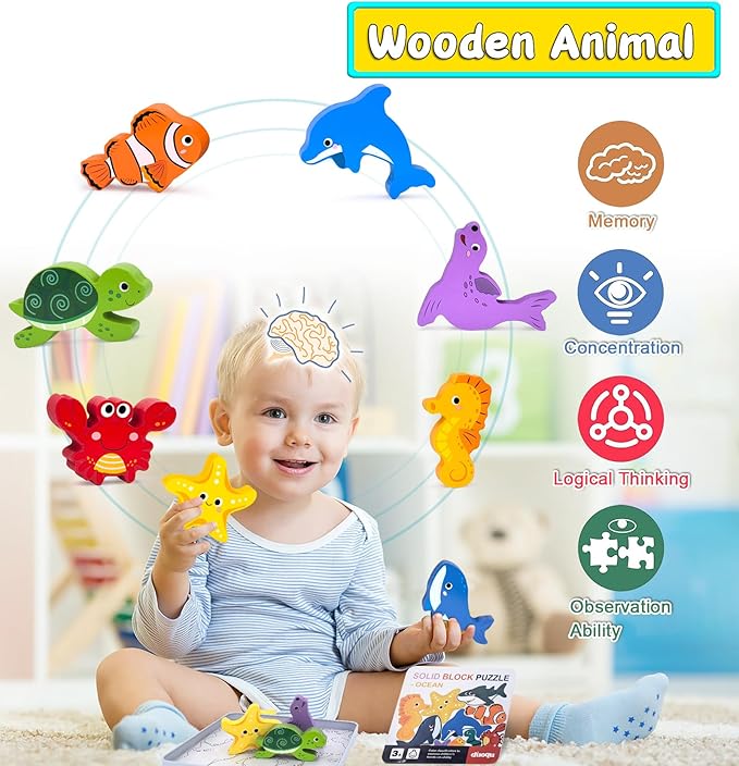 Wooden Animal Puzzles Toys for Toddlers,12 Pcs Sea Animals Figures,Animal Matching Sorting Stacking Toy for Boys Child Girls,Educational Learning Toys Gift for Kids