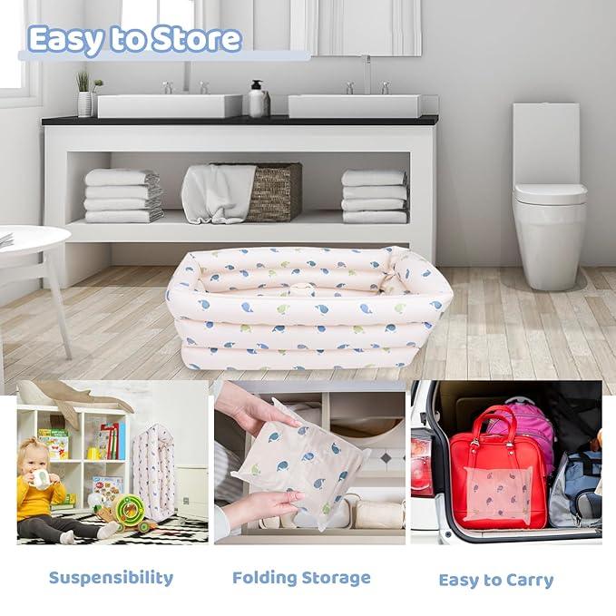 - Travel Baby Bathtub : The collapsible baby bathtub can be folded and carried, and can be inflated quickly through the inflatable valve when in use, easy to operate, easy to drain with a big water drain plug