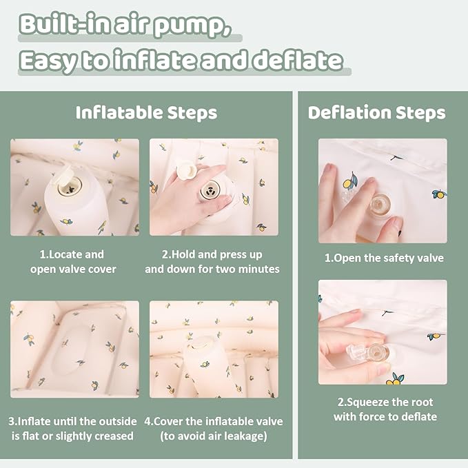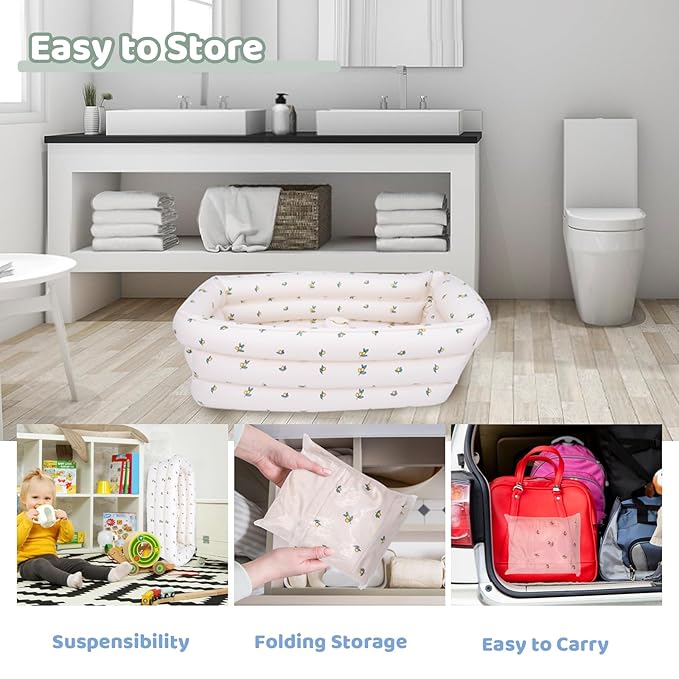 - Safety and Anti-slip : The inflatable toddler bathtub has a non-slip texture on the bottom and side, and a baby bath support in the middle to support the baby to sit up and not slip into the water