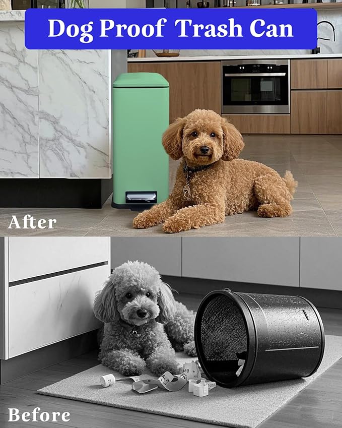 - Stylish Appearance Green cosmetic bin is made of stainless steel, which is fingerprint and rustproof. The waste basket is easy to clean and can be easily wiped clean with a damp cloth to restore the shine.