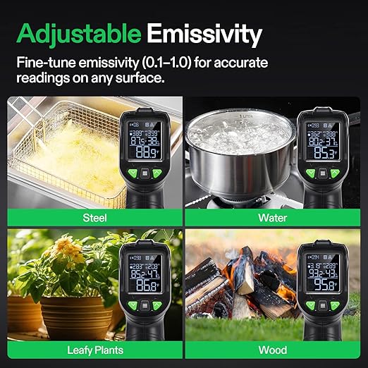 - Adjustable Emissivity & High Accuracy: Offers better control over your planting space; Emissivity range of 0.1 to 1.0 for accurate readings on various surfaces and conditions; 12:1 distance-to-spot ratio ensures safe measurements from afar