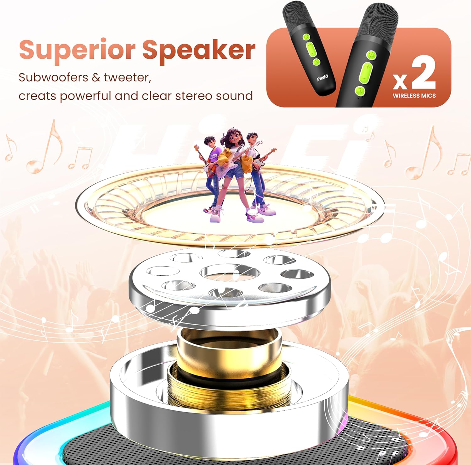 - 【6-10H WORRY-FREE BATTERY LIFE】: Peski's exclusive, long-life rechargeable battery technology. Quicker charging,and it can doubles as a power bank to charge your smartphone/tablet, long-time lasting design in order to make it easy to bring the party with you wherever you go,perfect for parties and family gatherings!