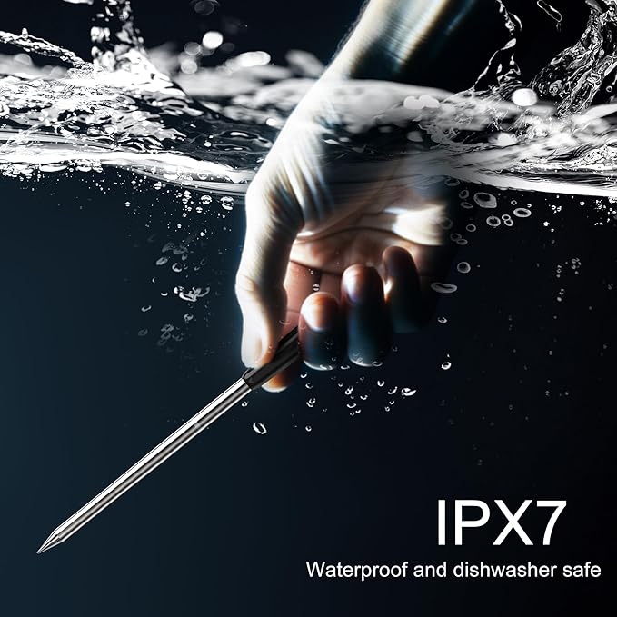 - Dual-Temperature Monitoring with Ceramic Probe: 2 ultra-thin wireless meat probe sensors track internal meat temp (212°F) and ambient Grill/Smoker temp (572°F) simultaneously. Heat-resistant ceramic handle ensures faster heat transfer & meat integrity. IPX7 waterproof probes and dishwasher safe, effortless cleaning.