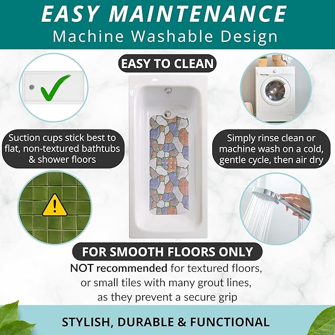- 360-DEGREE PROTECTION It features 200 well-placed suction cups that firmly anchor it in place, for max grip capacity. Ensuring a secure and non slip surface on your smooth bathtub or shower floor. Elevate your daily routine with a bath mat that prioritizes safety without compromising on style.