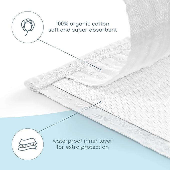 - 100% Natural Muslin Cotton top layer and waterproof inner layer - Our Muslin burp cloths are made of 100% organic cotton. It has a soft, pleasant structure of the fabric that easily absorbs moisture. It is breathable and skin-friendly with a lovely fluffy touch.