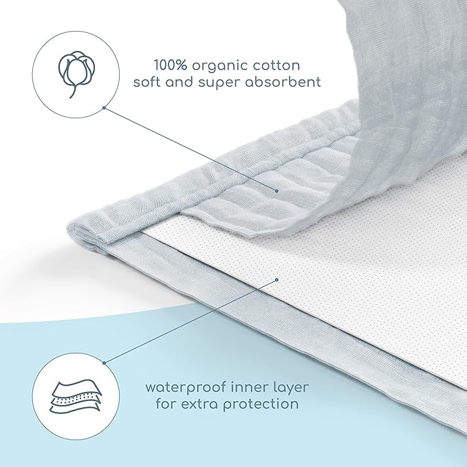 - 100% Natural Muslin Cotton top layer and waterproof inner layer - Our Muslin burp cloths are made of 100% organic cotton. It has a soft, pleasant structure of the fabric that easily absorbs moisture. It is breathable and skin-friendly with a lovely fluffy touch.