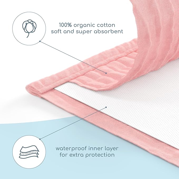 - 100% Natural Muslin Cotton top layer and waterproof inner layer - Our Muslin burp cloths are made of 100% organic cotton. It has a soft, pleasant structure of the fabric that easily absorbs moisture. It is breathable and skin-friendly with a lovely fluffy touch.