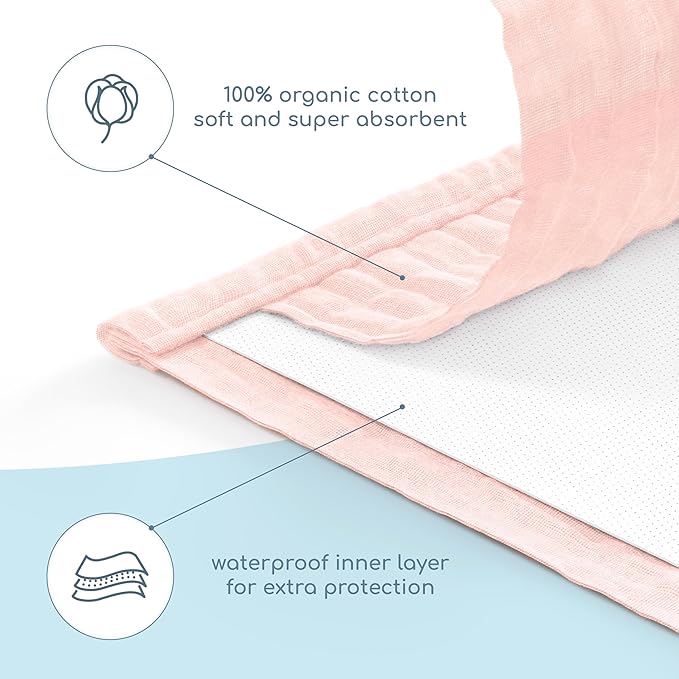 - 100% Natural Muslin Cotton top layer and waterproof inner layer - Our Muslin burp cloths are made of 100% organic cotton. It has a soft, pleasant structure of the fabric that easily absorbs moisture. It is breathable and skin-friendly with a lovely fluffy touch.
