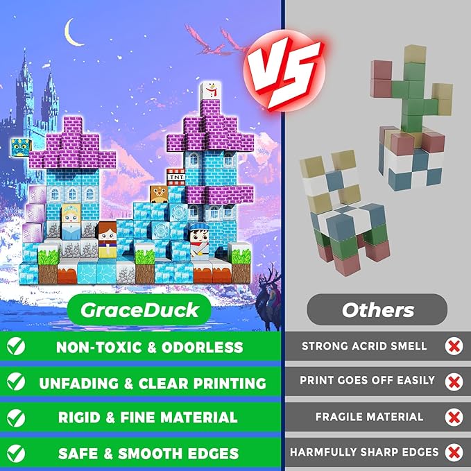 - 【 Build Ice Castle Magnetic Cube Kit】Including 150 magnetic cubes in 18 colors. Idea booklet with the storyline and beautiful patterns, keep them busy in clever ways. Graceduck magnetic activity cubes are made of high-quality ABS material and crafted with round edges and the right size. Our magnetic cubes kit with super strong internal magnetic, which is easier for toddlers ages 3+ to stick the cubes together and make builds sturdy. Perfect STEM toys help kids gain a deeper understanding of the structure and learn about magnetic properties!