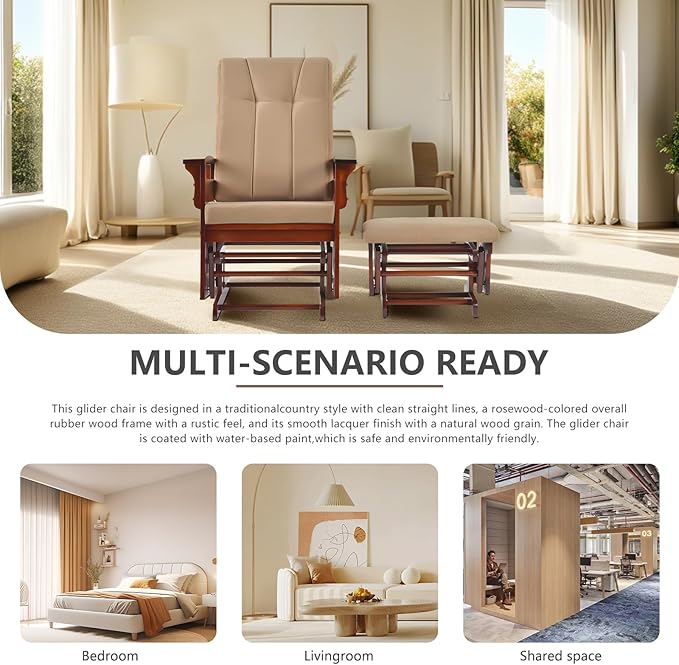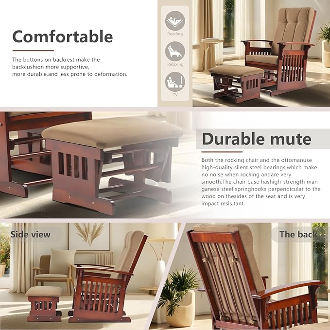 - 【Durable Material】: The glider chair with ottoman is made of solid rubber wood, and the entire frame is strong and stable.Both the rocking chair and the ottoman use high-quality silent steel bearings, which make no noise when rocking and are very smooth.The chair base has high-strength manganese steel spring hooks perpendicular to the wood on the sides of the seat and is very impact resistant.The seat cushion uses high-density foam, which has a good sense of support.