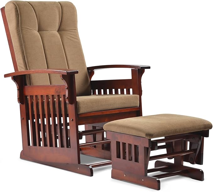 - 【Antique-Inspired Design】: This glider chair with ottoman has special antique-inspired design, its armrests and backrests have delicate spindle engravings.The buttons on backrest make the back cushion more supportive, more durable, and less prone to deformation.The seat and back cushions on the glider chair are removable, but not on the ottoman.