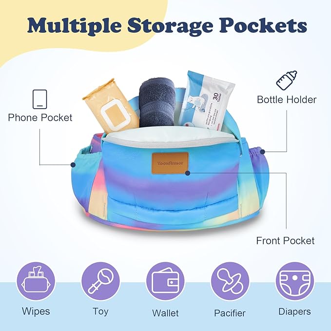 - Multiple Pockets: Toddler hip carrier features multiple storage pockets help to carry baby essentials when you out. Storage space under the seat for baby diapers and wipes. Keys and cell phone can be stored in the right side pocket and the left side organizer can store bottles