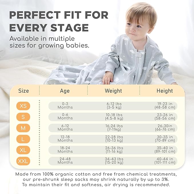 - 【PERFECT FIT FOR YOUR GROWING BABY】— To keep them comfortable & safe as they transition from newborns to curious adventurers, we created 4 different sizes of wearable blankets — Small sleeping sacks for 0-6 months babies, 10-18 lbs, Medium sleeping sacks for 6-12 months babies, 16-24 lbs, Large sleep sacks for 12-18 months babies, 22-28 lbs, & X-Large sleep sacks for 18-24 months babies, 26-36 lbs.