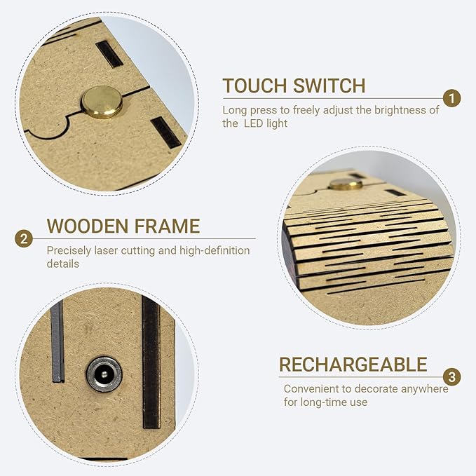 - 【Rechargeable Portability】 This 5D wood puzzle night light features a touchable switch and a USB interface for power charging, making it versatile for various settings. Simply plug it in and enjoy the soft glow of your new night light.