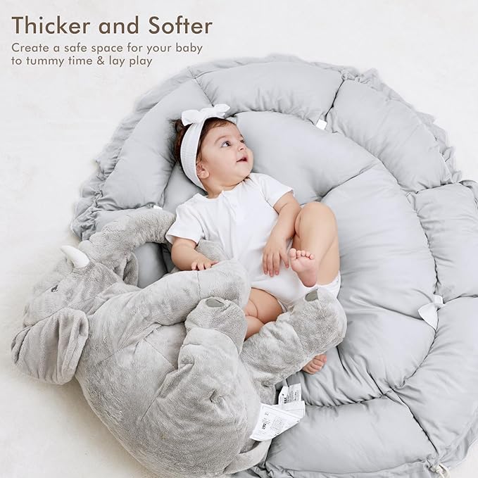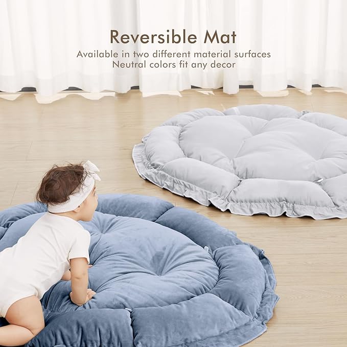 - THICKER & SOFTER: The reversible play mat crafted from premium plush material, offers a fantastic amount of cushion. Its neutral color scheme blends in with your home’s aesthetic so you can keep it out even after playtime is over.