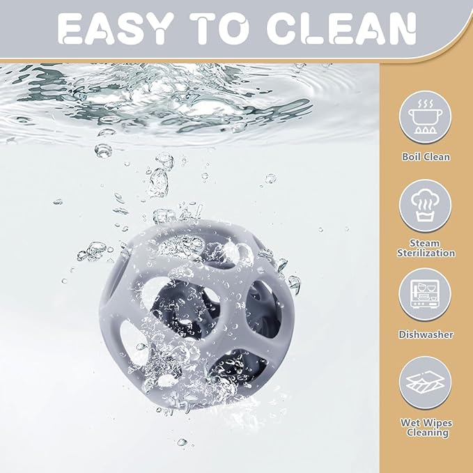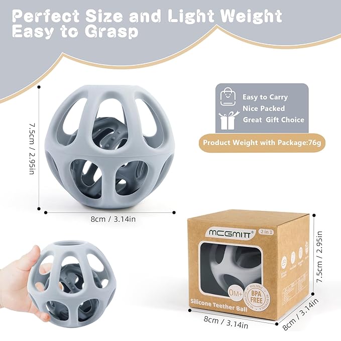 - 【Easy to Grasp & Hold】Designed with tiny hands in mind, this baby ball toy features a size and finger holes that's easy for infants to grasp, promoting motor skill development and sensory exploration. All teether balls do not have small part plugs to avoid the danger of choking hazard. Weight: 76g/2.68oz