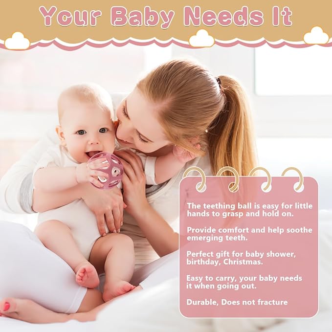 - 【Teething Relief】The soft teething toy eases the discomfort of teething and helps your baby get through the painful teething time. Lightweight and compact, the baby teether ball is easy to fit into a diaper bag.