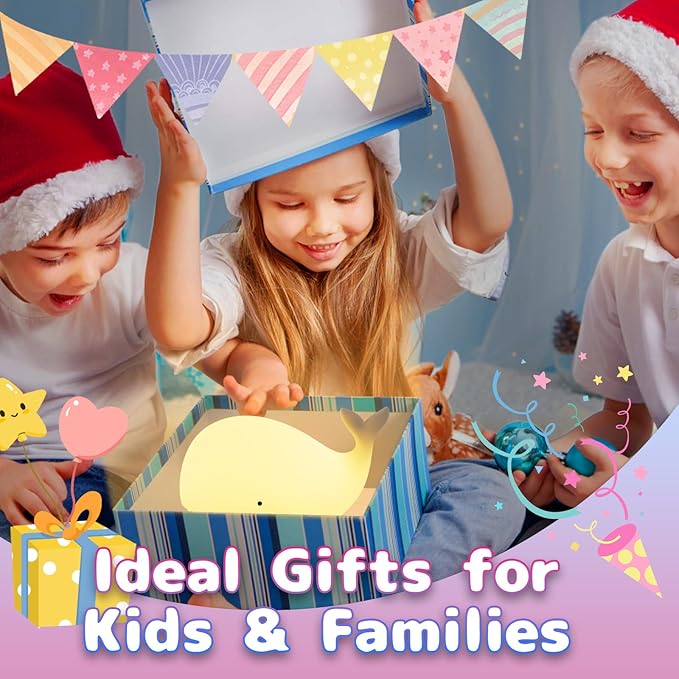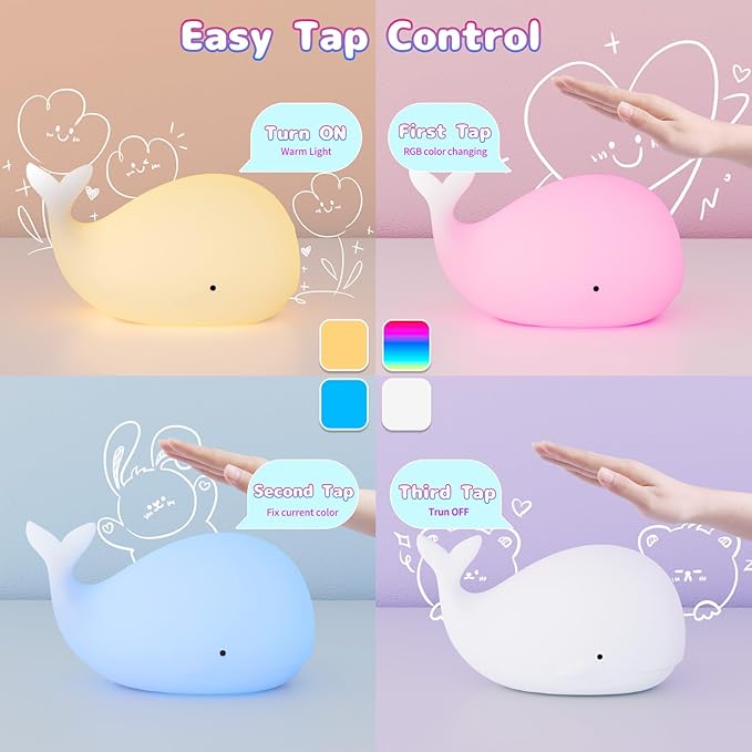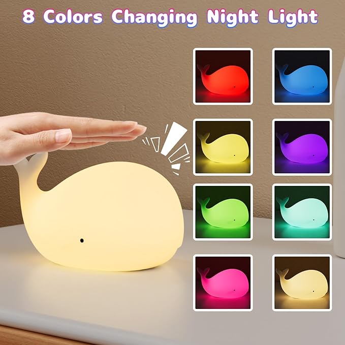 Silicone Night Light for Kids – Rechargeable Tap Control Lamp with 8 Colors, Cute Animal Design for Nursery, Toddler Room Decor, Gifts for Girls and Boys (Whale)