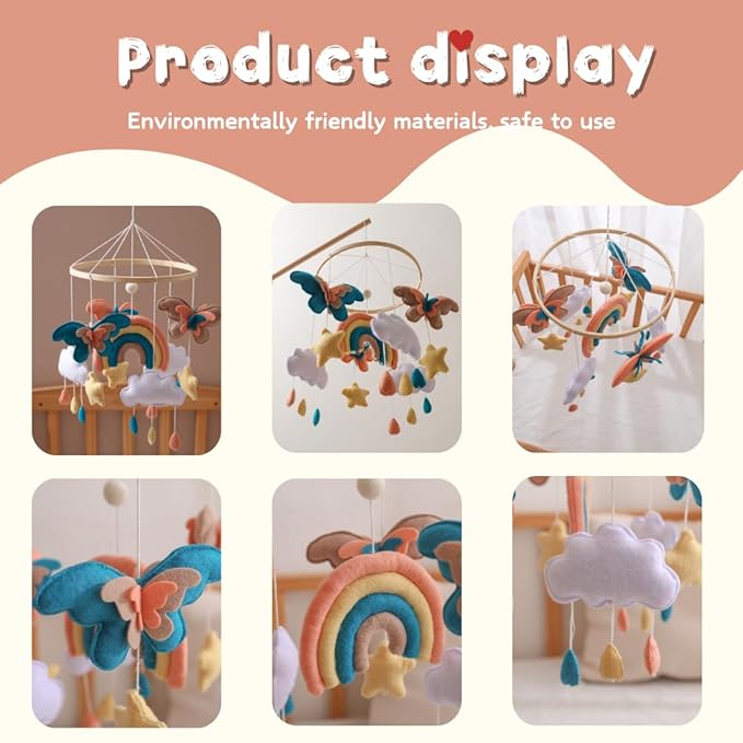 - Handcrafted with Love and Care Every element of this mobile is handcrafted with care, using soft felt and high-quality materials to ensure it’s safe for your baby. The delicate clouds, stars, and butterfly are carefully stitched together to create a mobile that’s not only visually stunning but also durable. The boho-style wooden frame and soft felt pieces make it a unique and charming focal point in any nursery.