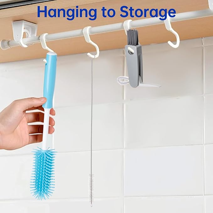 - Complete Water Bottle Cleaner Brush Set: This 3-pack cleaning kit includes a long handle silicone bottle brush, a straw cleaner brush, and a versatile 3-in-1 cup lid cleaning brush. Perfect for cleaning water bottles, bottle caps, straws, and more. The brushes are designed for easy storage with a convenient hanging feature, making organization a breeze