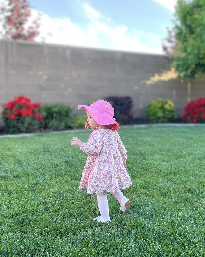 - ADJUSTABLE FIT: The baby bucket hat with adjustable head circumference, you can easily adjust the head size to fit growing baby's head.The adjustable chin strap goes around like their neck or chin area to keep it from falling off. Perfect for outside playing for babies and toddlers in sunny days.