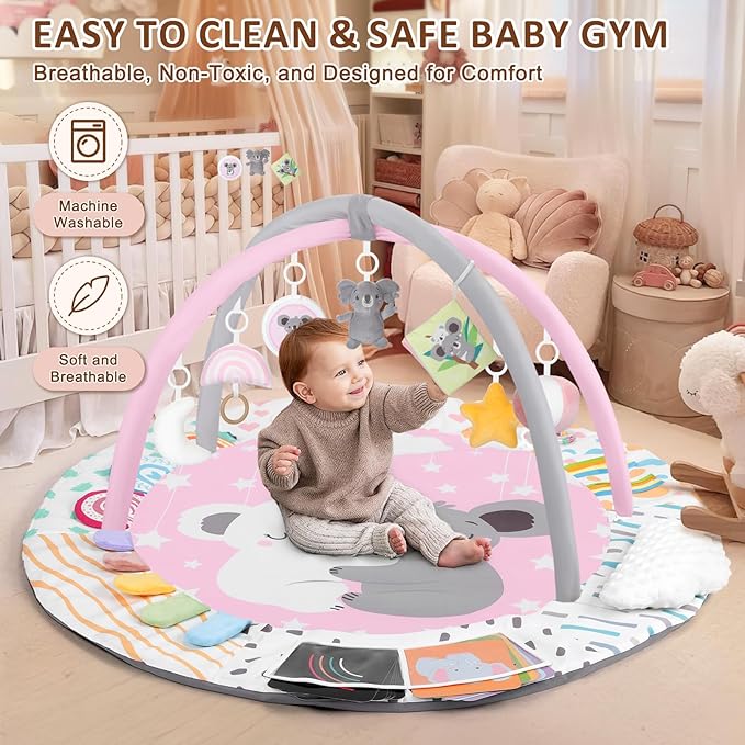 Baby Play Gym & Activity Mat, Tummy Time Mat with Tummy Time Pillow 7 Detachable Sensory Toys and Educational Cards for Motor Skills & Sensory Development, Baby Essentials Shower Gift, Pink Koala