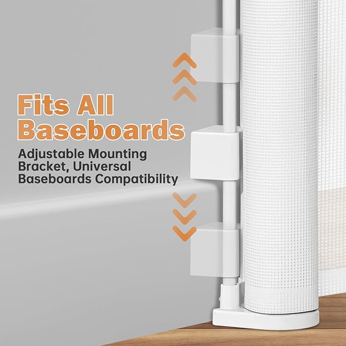 - 【Fiberglass Support】We have upgraded the retractable gate with fiberglass support strips, which prevent kids and pets from going under the mesh and reduce wrinkling. The mesh expands smoothly without getting stuck, making it effortless to use.