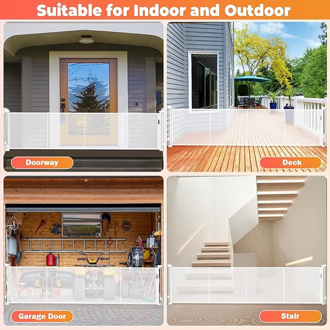 - 【Versatile for Indoor and Outdoor Use】 This retractable dog gate is designed to meet your needs both indoors and outdoors. It can be installed in living rooms, kitchens, stairways, and other interior areas, as well as in hallways, garages, patios, pools, backyards, and other outdoor spaces. Keep your little ones and pets safe from hazardous areas with this reliable solution!
