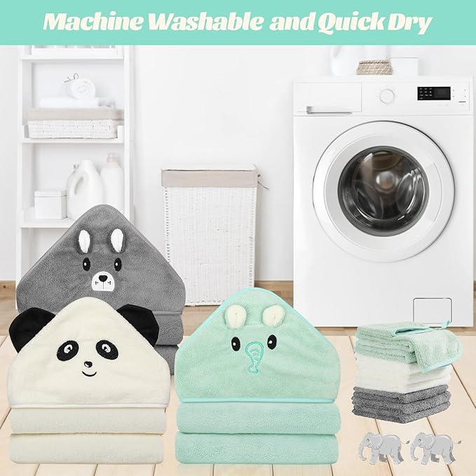 - [Cute Design-Baby's Bath Time Buddy] Our newborn baby towels include three adorable baby towels with hood featuring playful characters: a green elephant, a gray bear, and a white panda. These playful characters make bath time fun and cozy, while the hood keeps your little one warm and dry. Your little angel is sure to love these charming baby towels and washcloths set