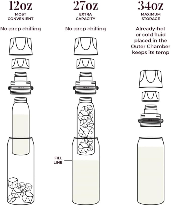 - FLEXIBLE CHILLING & STORAGE: The OG inner chamber bottle can be removed or used as needed. Store 12oz or 27oz with ice, and 34oz without. One container, flexing to supply.