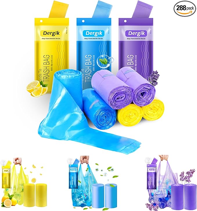 - 【Rich Colors】2 rolls blue, 2 rolls yellow, 2 rolls purple, total 6 rolls, make your life more colorful.With recycled plastic,healthy for Adults & Baby. Clear & tidy breakpoints, you can tear from the rolls quickly and easily to get the diaper disposal sacks , quickly disposable feminine and incontinence products scented garbage bag