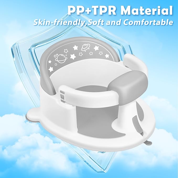 - Made from high-quality, durable materials, a combination of PP and TPR, this baby bath seat is 100% safe for use, gentle on the skin, easy to clean, and CPSC certified for peace of mind. The non-slip padding and backrest offer extra comfort and safety, and the enhanced seat design allows water to reach in all directions for thorough cleaning