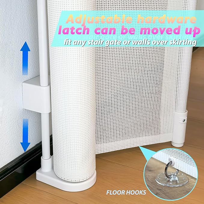 - Safety Double Lock Design - The retractable mesh gate features two locking mechanisms: a mesh lock that controls the mesh's extension and retraction, and a hidden gate lock for opening and closing the gate. Designed for adult convenience, it remains particularly challenging for children, effectively preventing them from opening the gate alone and accessing hazardous areas.