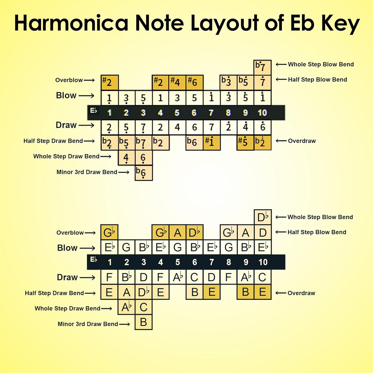 - 10 Hole Diatonic Harmonica: which features 10 holes with reeds tuned to the key of E flat. It's allowed to play a complete 7-note scale of the key.With advanced playing techniques, you can produce additional notes from outside the scale, adding depth and versatility to your music