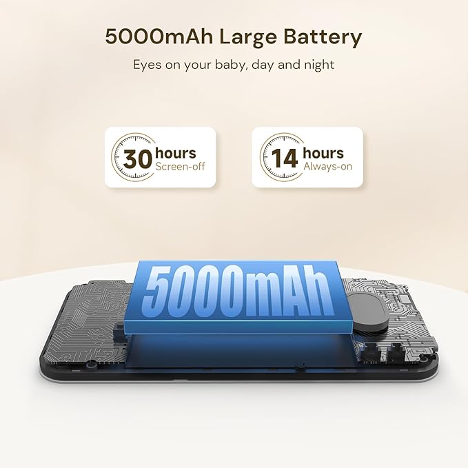- Extended 30-Hour Battery Life: Powered by a 5000mAh battery, this video baby monitor lasts 14 hours in continuous mode and 30 hours in voice-activated (VOX) mode. 3-4 nights per charge and the low-battery alert ensures you never miss a moment for your baby