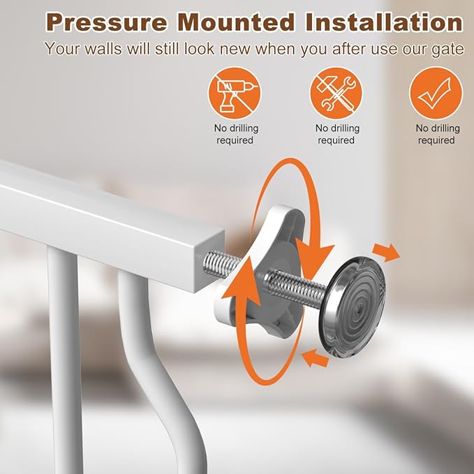 - Easy Installation: Our baby gates extra wide featuring a pressure-mounted design, this pet gates for doorways no drilling, it comes with 4 adjustable pressure bolts, no additional tools required, and no need for wall holes, just install it on the four corners of the tall door gate bar, This mounting design prevent damage to walls. Please don't cut the tie until you successfully install the wide baby gates for dogs, contact us if you encounter any installation issues