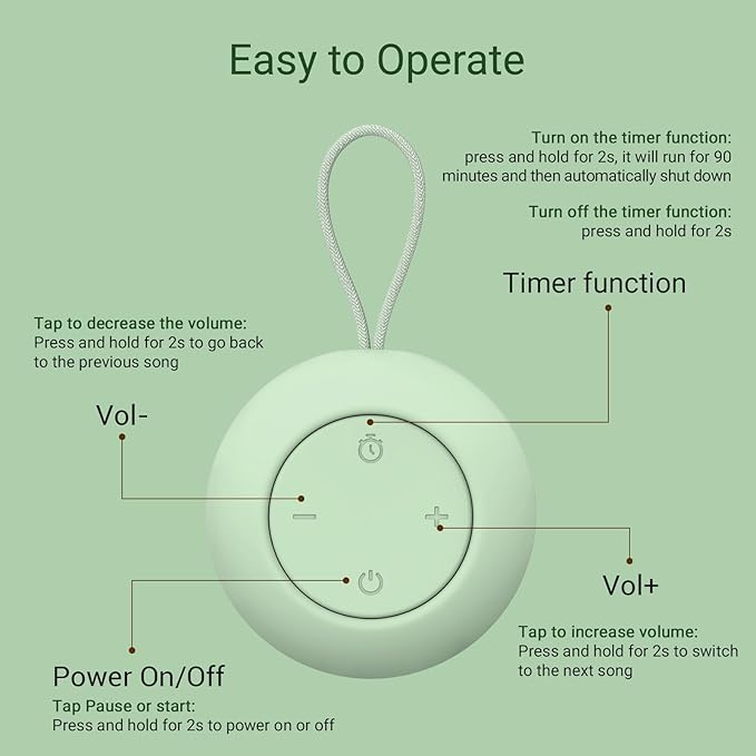 - White noise on the go: Portable sound machine with 12 kinds of the most soothing white noise can carry everywhere. Sounds including: White Noise, Hush, Heartbeat, Ocean and more.