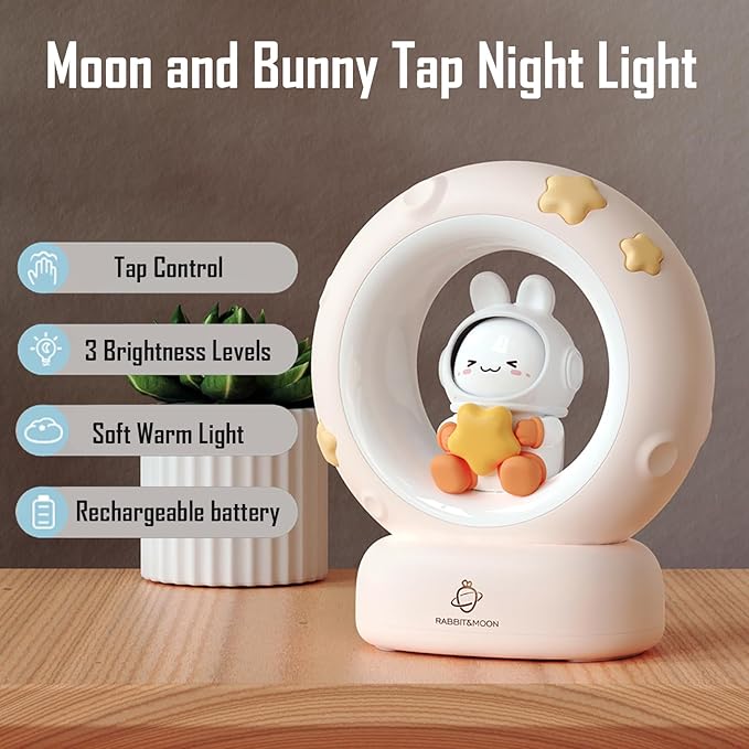 - [Cute Appearance for Kids] This night light has a novel and unique design. On the moon, there is a little bunny wearing a space suit, these are elements that children like. So this night light is perfect for kid's room, nursery, or as a gift for kids.