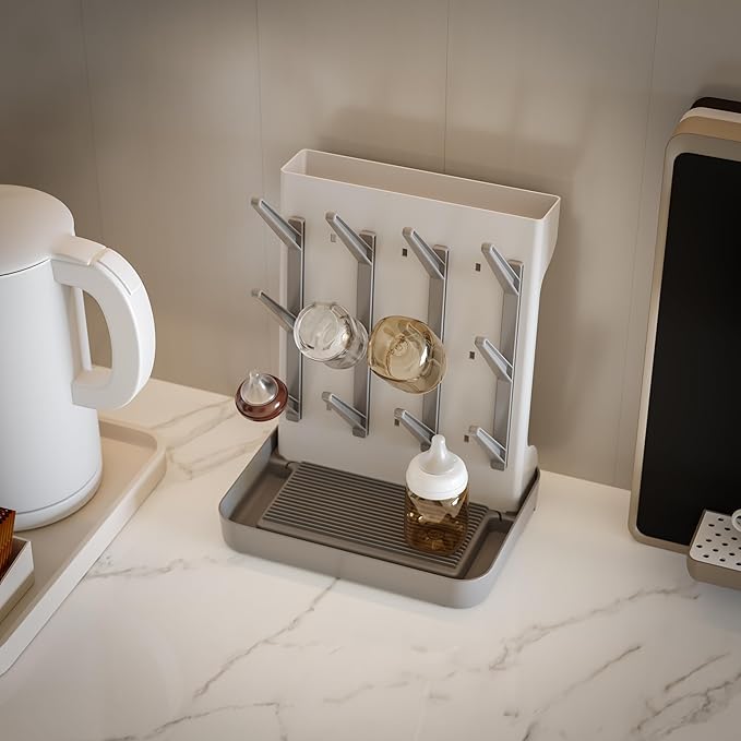- Removable Bottom Tray:The quick-drying vertical design allows the water to drain into the removable bottom,keeping your counter dry and tidy. Spacious tray provide extra grip, even if some heavy glass cup is suspended, it will not tip over,ensuring your rack stays securely in place on any countertop.