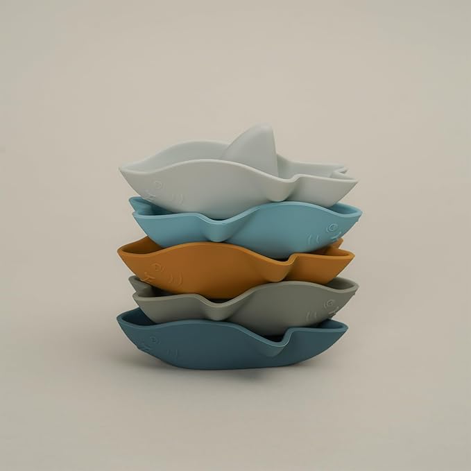 Bessentials Silicone Stackable Baby Shark Boat Bath Toys Set, Mold-Free Floating Bathtub Toys for Baby & Toddler,BPA Free,Set of 5