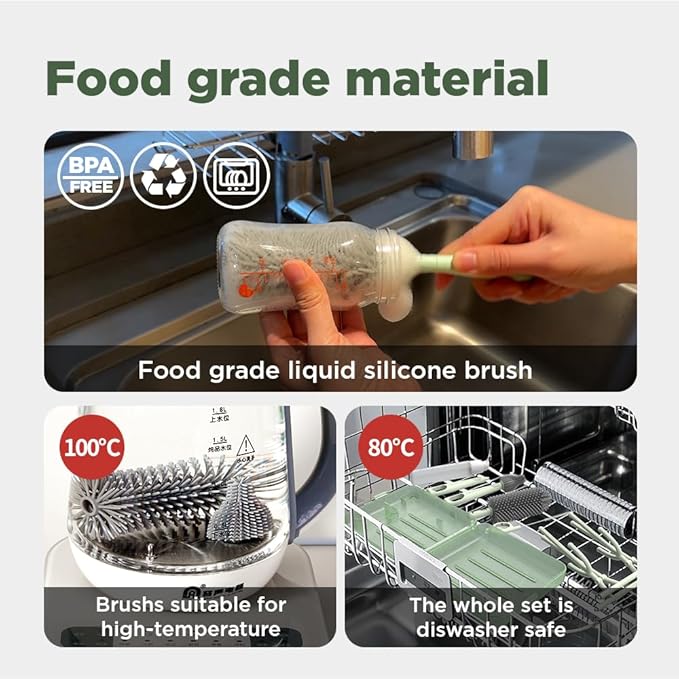- 【Durable Liquid Silicone Brushes】Made with liquid silicone, these brushes resist buildup better than nylon or sponge. They’re durable, easy to clean, and gentle on bottles—perfect for any portable bottle cleaning kit.