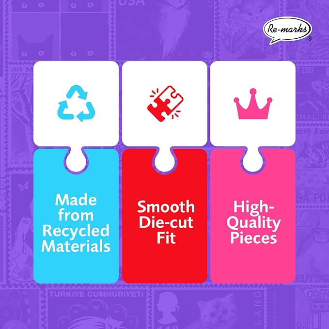 - PUZZLE ART FOR CAT LOVERS: With its collage of adorable international cat stamps, this Re-marks puzzle is sure to make you smile. The cats and kittens featured on this puzzle are illustrated in bright colors with detailed imagery. Have fun spending time with some of the cutest feline postage stamps in history with this fun puzzle.