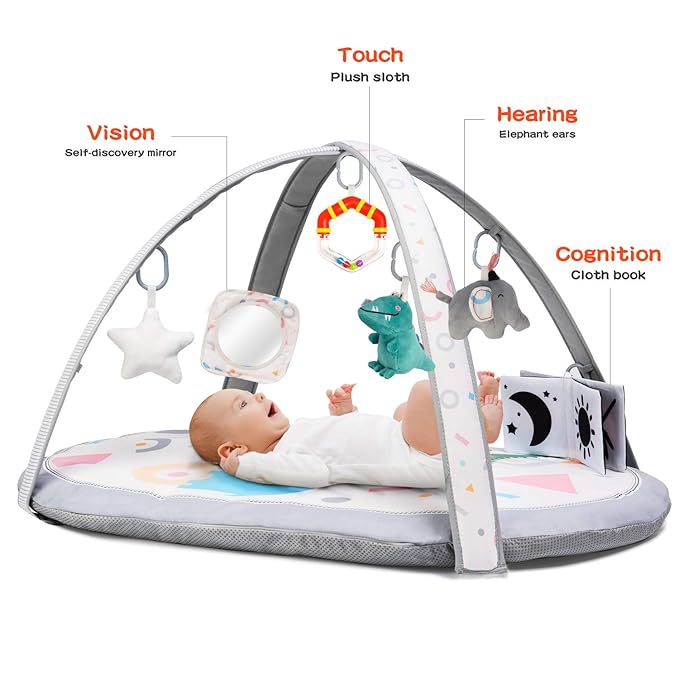 - 7-in-1 All-Round Developmental Play Mat: This versatile play mat includes 6 removable sensory toys and 1 tummy time moon pillow, catering to all aspects of your baby's growth. The toys include a baby-safe mirror for self-discovery, a tactile ribbon rattle, an organic cotton star, a dinosaur for tactile stimulation, elephant crinkle ears for auditory development, and a cloth book for color and graphic recognition. The moon pillow supports tummy time, promoting healthy development.