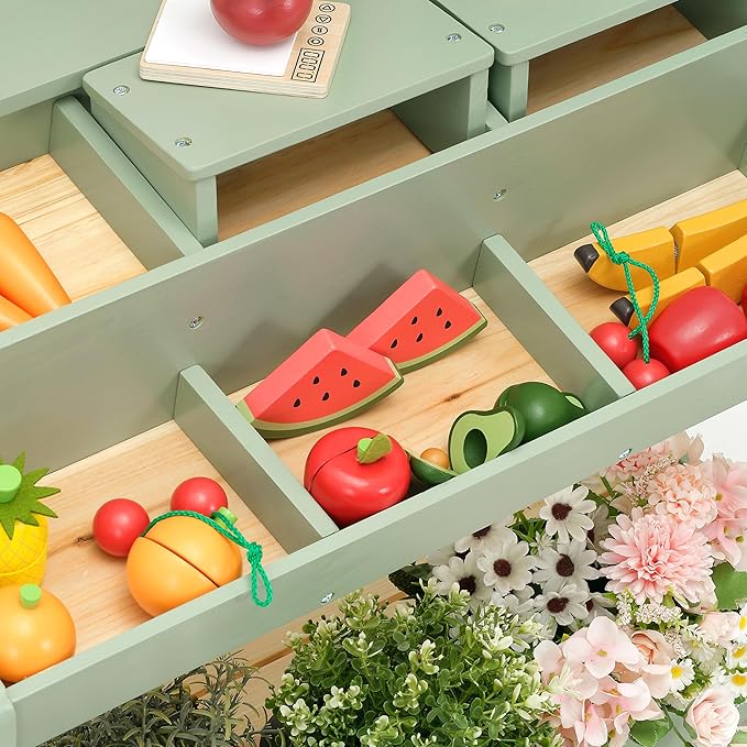 PairPear Wooden Mud Grocery Stand, 2-in-1 Outdoor Market Stand & Mud Kitchen for Kids Outdoor, Montessori Pretend Play Toy with 14 Accessories, Cash Register & Play Food, Ages 3+ in Green