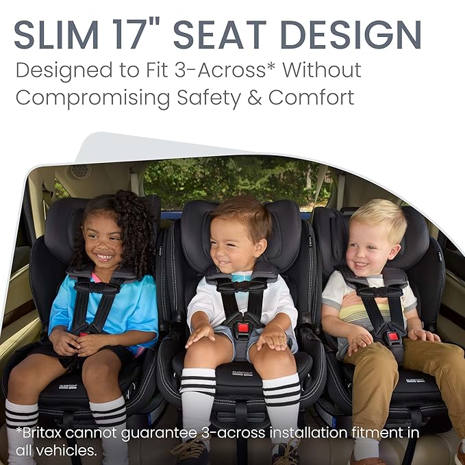 - SpaceSaver Design: Slim 17" seat is designed to fit 3-across* without compromising on trusted Britax safety and premium comfort. *Britax cannot guarantee 3-across installation fitment in all vehicles