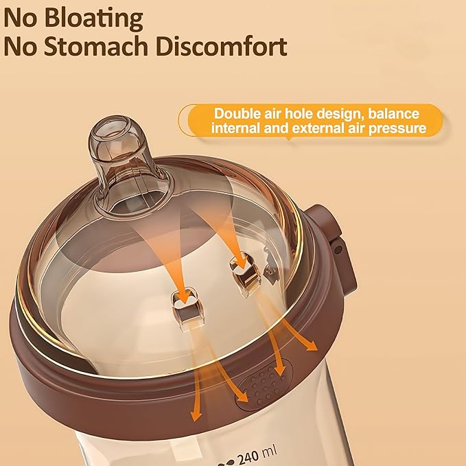 - 【Spill-Proof & Leak-Proof】Say goodbye to messy spills! The airtight lid prevents leaks, while the double air-hole design balances internal and external air pressure, significantly reducing colic, tension and discomfort