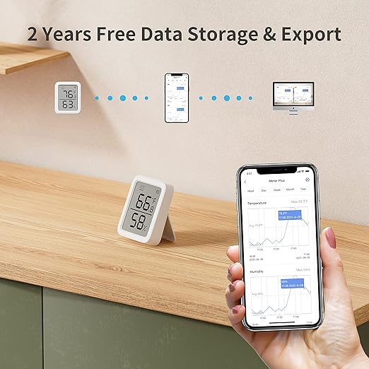 - Exportable Data - 394ft connecting distance (no obstacles) allows you to quickly and clearly view the temperature and humidity yearly, monthly, daily, or by the hour. Enjoy up to 68 days On-board Data Storage and up to 2 years In-App Data Storage(Unlimited cloud storage if SwitchBot Hub is added). Data can be exported as. csv file for more in-depth analysis of your environmental. Supports multiple methods of data calibration.