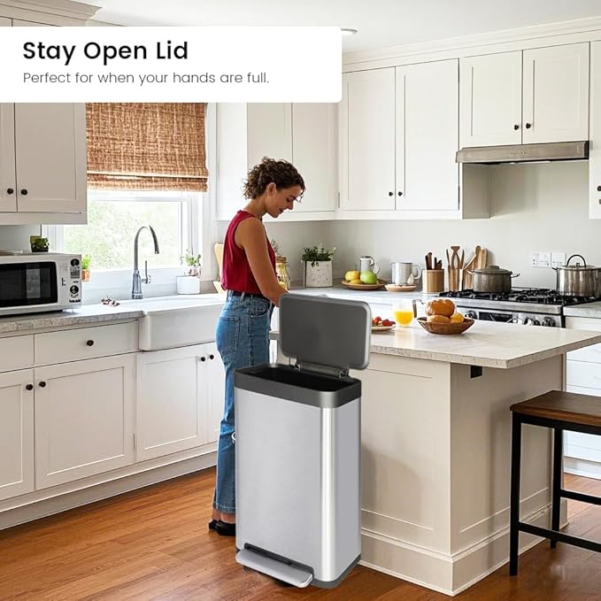- Stay-Open & Soft-Close Lid – The 13 gallon step trash can offers hands-free operation and a quiet-close mechanism.