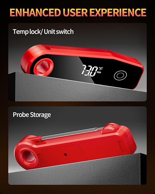 - ULTRA-FAST AND PROFESSIONALLY ACCURATE: The digital food thermometer utilizes sensitive temperature probe and thermocouple technology for an accuracy of ±0.5°F (±0.3°C) for fast, accurate temperature readings in less than 0.5 seconds. Measures temperatures from -58°F to 572°F (- 50°C to 300°C). The ultimate kitchen tool for chefs and home cooks to ensure precise cooking when grilling, simmering soups and making delicious desserts